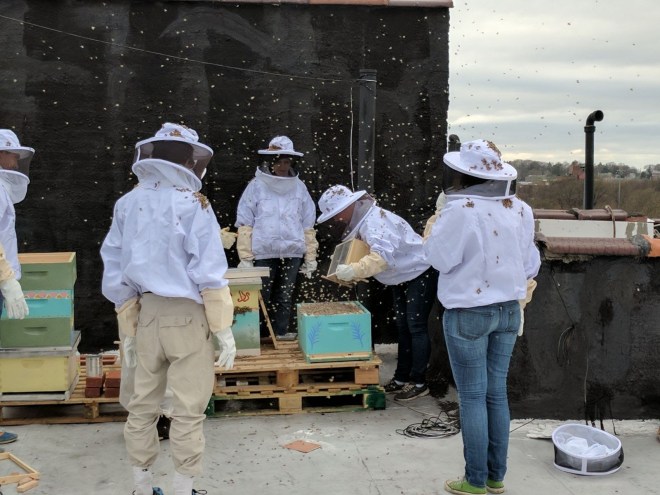 • Below is a picture of Q Gardens’ hives, located on the rooftop of a residential building in Flatbush, Brooklyn.