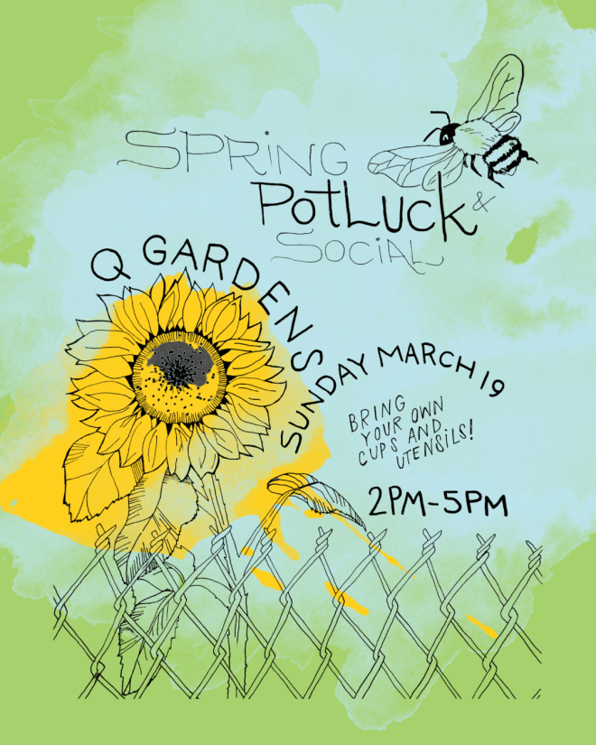 Come meet new and returning QG volunteers, ask any questions you have, get excited to plug into garden activities this year, and share yummy food! If possible, please bring your own cup and utensils 🙂